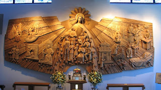 We stopped by the Shrine of St Therese on the way to take David to O'Hare airport. Located only 10 miles south of the airport, it was a convenient stop. We arrived minutes before the 11:30 mass in the chapel, where there is an immense wood carving depicting events in the life of St Therese. Opposite our seats in the chapel was a stained glass window depicting the "Dark Night of the Soul" as described by St John Vianney. In the shrine is a reliquary donated by the Carmelite Sister of Indianapolis. While there, Theresa recalled inscribing a prayer request during our visit many years back to "bring our son back to the church." Since we were taking him to O'Hare to catch a flight to Scotland where he will join the Redemptorists Monastery, I'd say the prayers were answered. David is likely to return to the US for seminary in Denton NE (just outside of Lincoln). We said tearful goodbyes to David at the airport and drove home.
