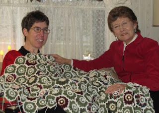 Theresa has been working for weeks to connect a zillion of the yarn daisies Eileen has made into an Afghan. She chose the daisies colored to complement Eileen's sofa. We also bought a number of the calendars from the Redemptorists. Here, Theresa shows Eileen photos of some of the places at her her brother's new home in Scotland.
